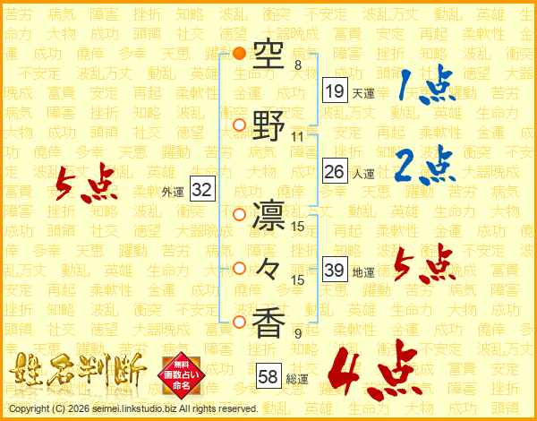 空(8画)野(11画) 凛(15画)々(15画)香(9画)