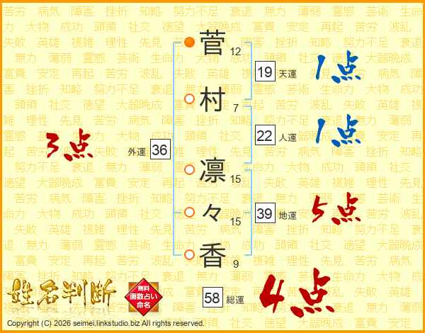 菅(12画)村(7画) 凛(15画)々(15画)香(9画)