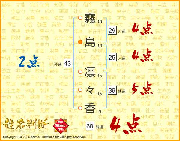 霧(19画)島(10画) 凛(15画)々(15画)香(9画)