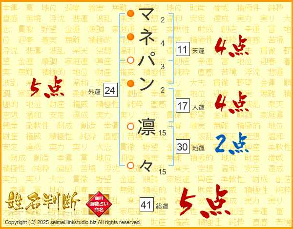 マ(2画)ネ(4画)パ(3画)ン(2画) 凛(15画)々(15画)