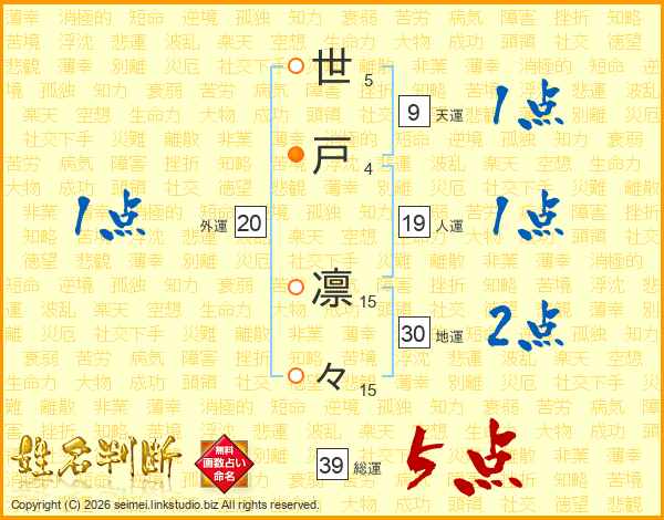 生活面を象徴する運勢です。外部から受ける影響力を表し、結婚運、家庭運や職場、環境への順応性を表します。総運から人運を引いた画数。姓や名が1文字の場合を除く。