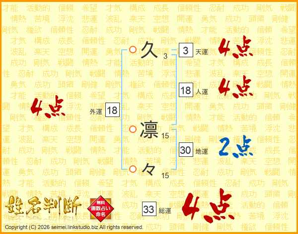 生活面を象徴する運勢です。外部から受ける影響力を表し、結婚運、家庭運や職場、環境への順応性を表します。総運から人運を引いた画数。姓や名が1文字の場合を除く。