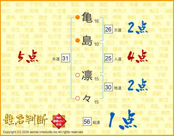 亀(16画)島(10画) 凛(15画)々(15画)