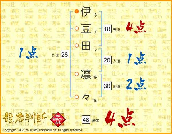 伊(6画)豆(7画)田(5画) 凛(15画)々(15画)