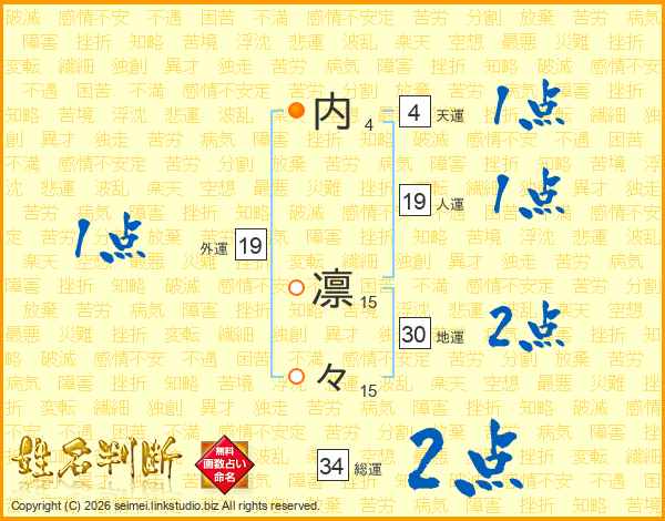 生活面を象徴する運勢です。外部から受ける影響力を表し、結婚運、家庭運や職場、環境への順応性を表します。総運から人運を引いた画数。姓や名が1文字の場合を除く。
