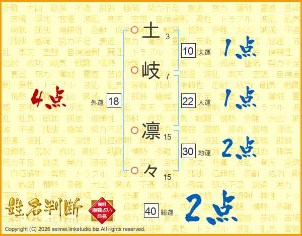 生活面を象徴する運勢です。外部から受ける影響力を表し、結婚運、家庭運や職場、環境への順応性を表します。総運から人運を引いた画数。姓や名が1文字の場合を除く。