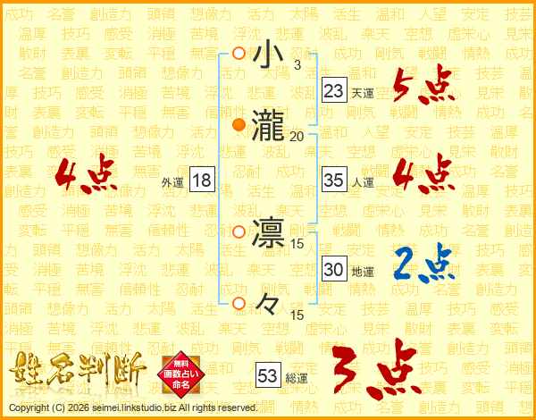 小(3画)瀧(20画) 凛(15画)々(15画)