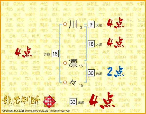 生活面を象徴する運勢です。外部から受ける影響力を表し、結婚運、家庭運や職場、環境への順応性を表します。総運から人運を引いた画数。姓や名が1文字の場合を除く。
