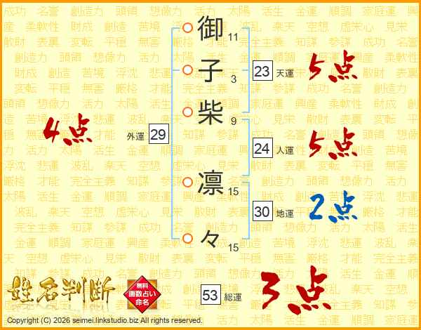 御(11画)子(3画)柴(9画) 凛(15画)々(15画)