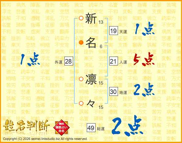 生活面を象徴する運勢です。外部から受ける影響力を表し、結婚運、家庭運や職場、環境への順応性を表します。総運から人運を引いた画数。姓や名が1文字の場合を除く。