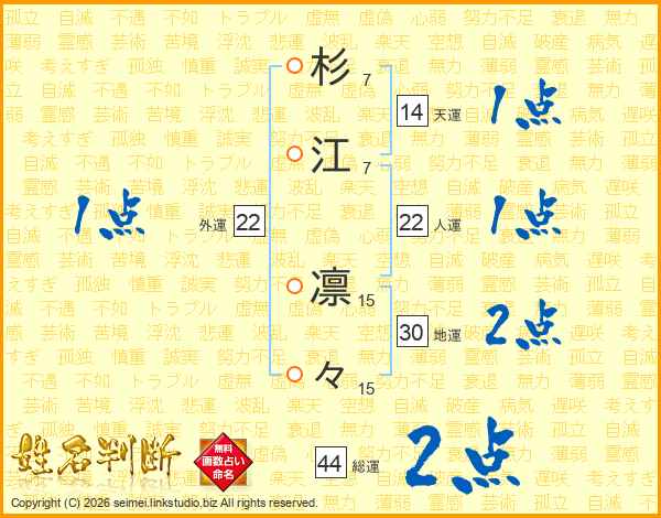 生活面を象徴する運勢です。外部から受ける影響力を表し、結婚運、家庭運や職場、環境への順応性を表します。総運から人運を引いた画数。姓や名が1文字の場合を除く。