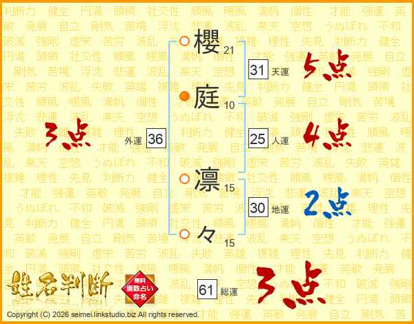 櫻(21画)庭(10画) 凛(15画)々(15画)