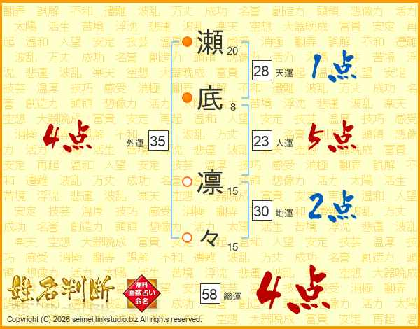 瀬(20画)底(8画) 凛(15画)々(15画)