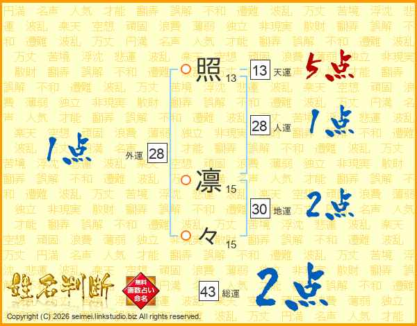 生活面を象徴する運勢です。外部から受ける影響力を表し、結婚運、家庭運や職場、環境への順応性を表します。総運から人運を引いた画数。姓や名が1文字の場合を除く。