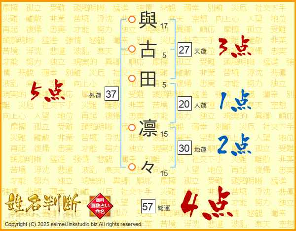 與(17画)古(5画)田(5画) 凛(15画)々(15画)