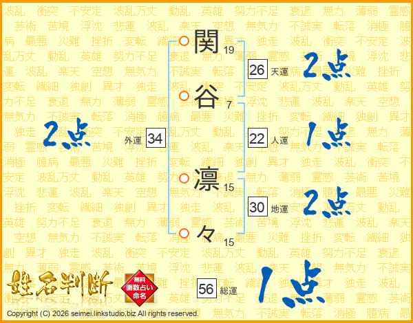 生活面を象徴する運勢です。外部から受ける影響力を表し、結婚運、家庭運や職場、環境への順応性を表します。総運から人運を引いた画数。姓や名が1文字の場合を除く。