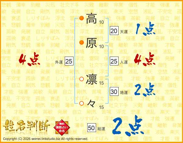 生活面を象徴する運勢です。外部から受ける影響力を表し、結婚運、家庭運や職場、環境への順応性を表します。総運から人運を引いた画数。姓や名が1文字の場合を除く。