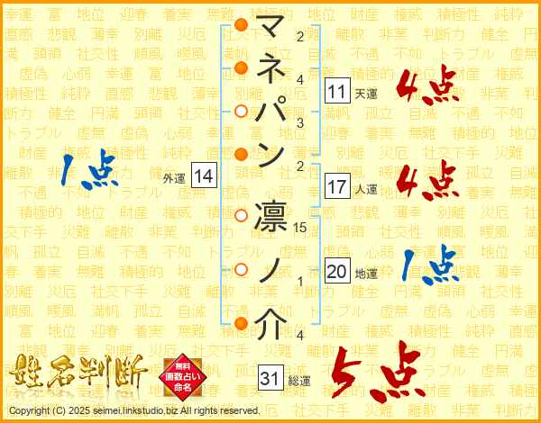 マ(2画)ネ(4画)パ(3画)ン(2画) 凛(15画)ノ(1画)介(4画)
