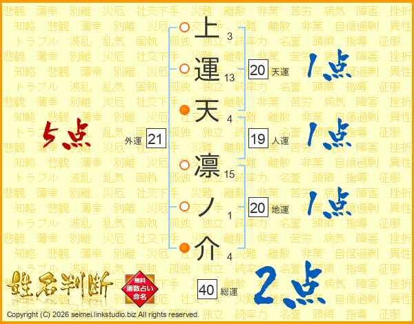 上(3画)運(13画)天(4画) 凛(15画)ノ(1画)介(4画)