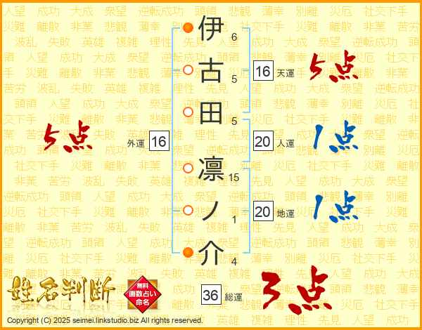伊(6画)古(5画)田(5画) 凛(15画)ノ(1画)介(4画)