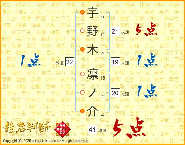 宇(6画)野(11画)木(4画) 凛(15画)ノ(1画)介(4画)