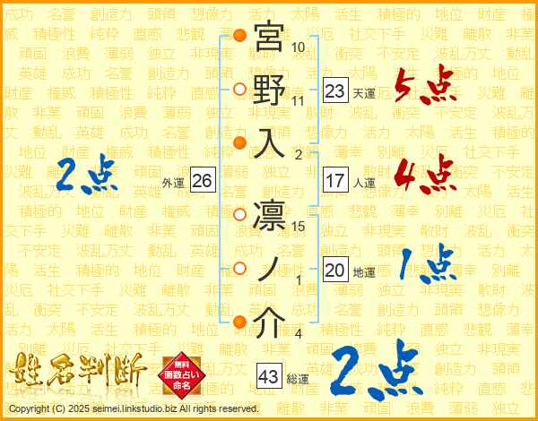宮(10画)野(11画)入(2画) 凛(15画)ノ(1画)介(4画)