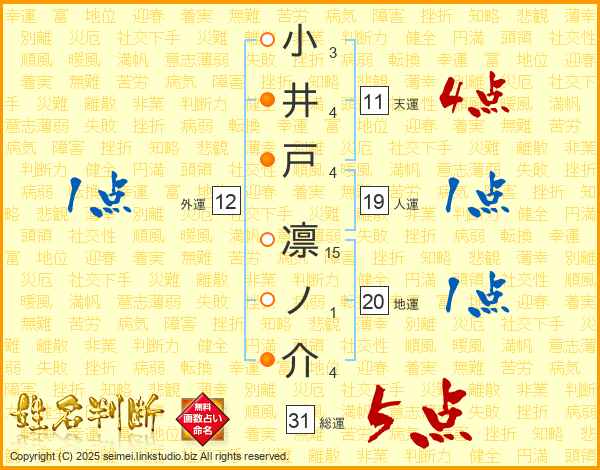 小(3画)井(4画)戸(4画) 凛(15画)ノ(1画)介(4画)