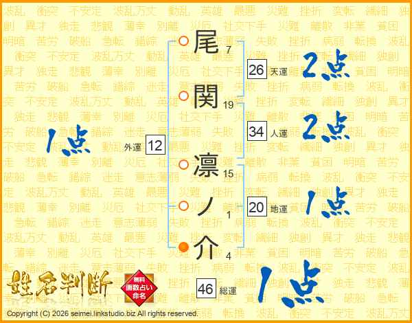 尾(7画)関(19画) 凛(15画)ノ(1画)介(4画)