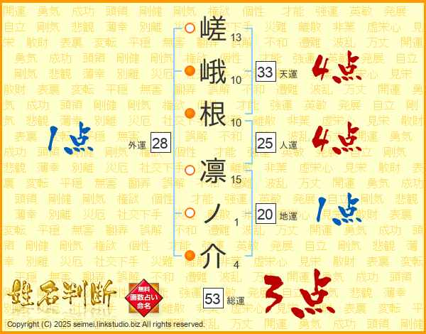 嵯峨根凛ノ介さんの総運は53画の3点!