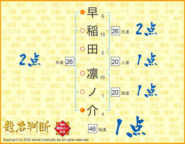早(6画)稲(15画)田(5画) 凛(15画)ノ(1画)介(4画)
