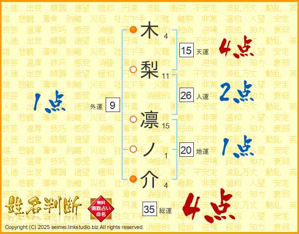 木(4画)梨(11画) 凛(15画)ノ(1画)介(4画)