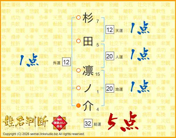 杉(7画)田(5画) 凛(15画)ノ(1画)介(4画)