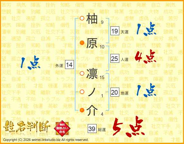 柚(9画)原(10画) 凛(15画)ノ(1画)介(4画)