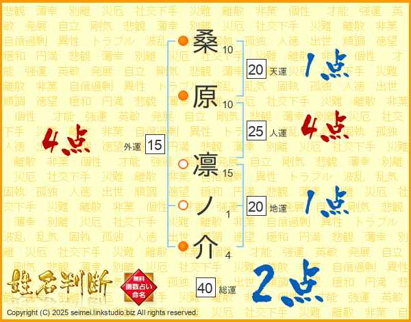 桑(10画)原(10画) 凛(15画)ノ(1画)介(4画)