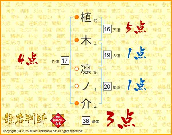 生活面を象徴する運勢です。外部から受ける影響力を表し、結婚運、家庭運や職場、環境への順応性を表します。総運から人運を引いた画数。姓や名が1文字の場合を除く。