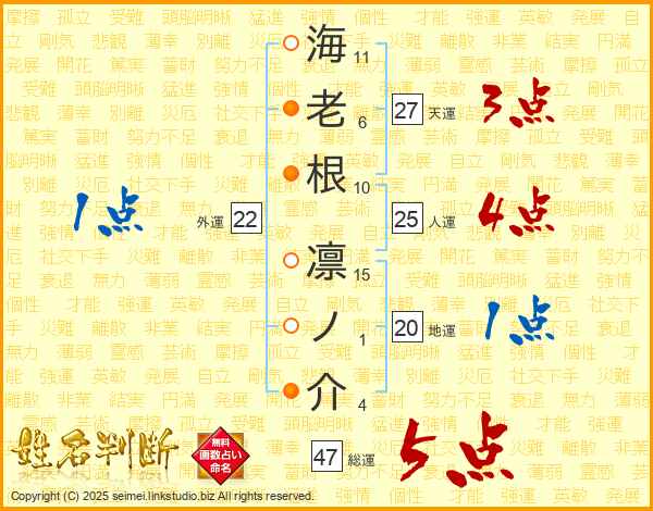 海(11画)老(6画)根(10画) 凛(15画)ノ(1画)介(4画)
