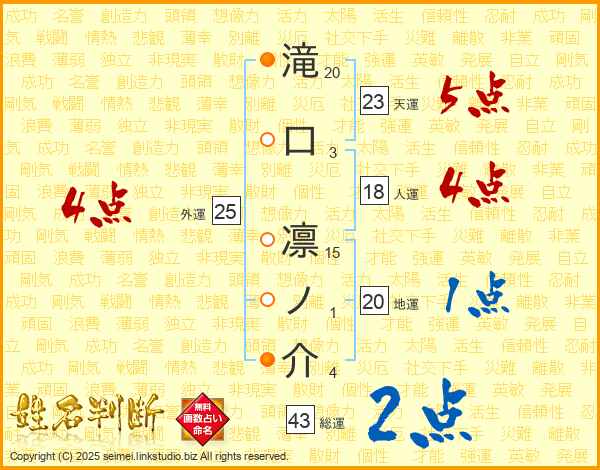 滝(20画)口(3画) 凛(15画)ノ(1画)介(4画)