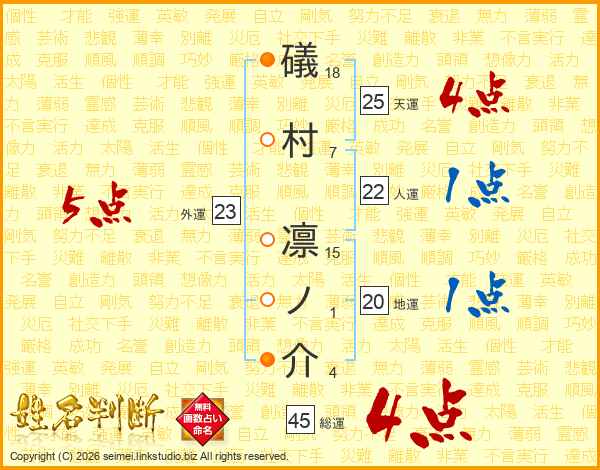 礒(18画)村(7画) 凛(15画)ノ(1画)介(4画)