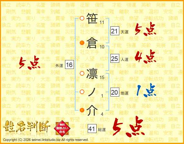笹(11画)倉(10画) 凛(15画)ノ(1画)介(4画)