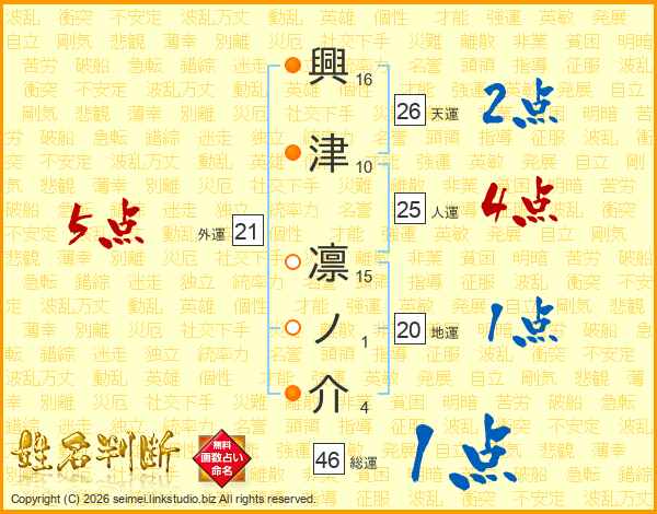 興(16画)津(10画) 凛(15画)ノ(1画)介(4画)