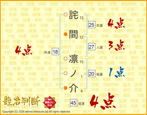 詫(13画)間(12画) 凛(15画)ノ(1画)介(4画)