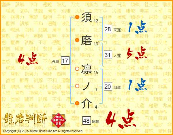 須(12画)磨(16画) 凛(15画)ノ(1画)介(4画)