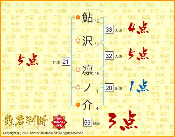 鮎(16画)沢(17画) 凛(15画)ノ(1画)介(4画)