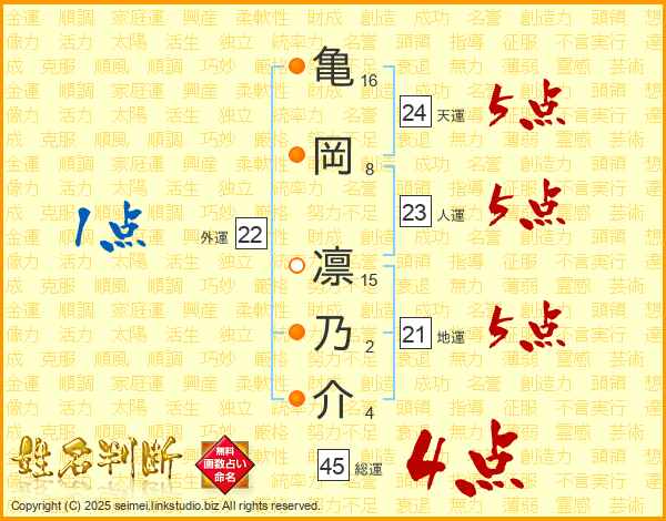 亀(16画)岡(8画) 凛(15画)乃(2画)介(4画)