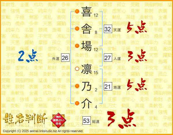 喜(12画)舎(8画)場(12画) 凛(15画)乃(2画)介(4画)