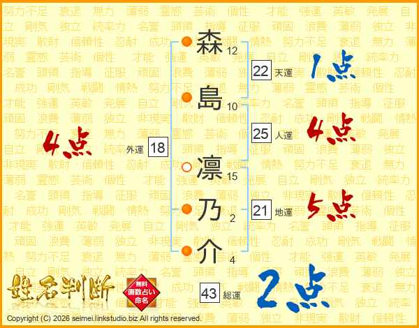 森(12画)島(10画) 凛(15画)乃(2画)介(4画)