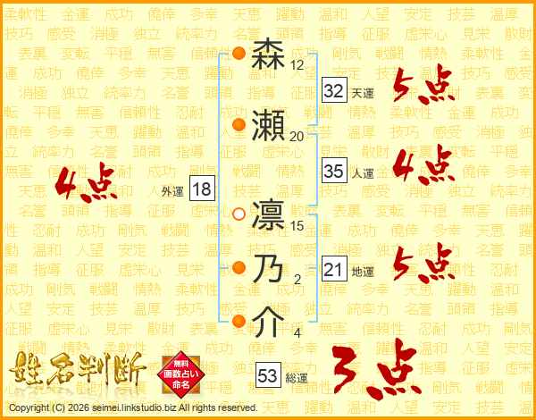 森瀬凛乃介さんの総運は53画の3点!