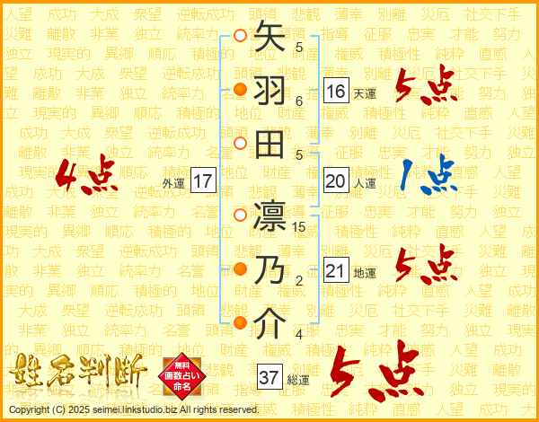 矢(5画)羽(6画)田(5画) 凛(15画)乃(2画)介(4画)