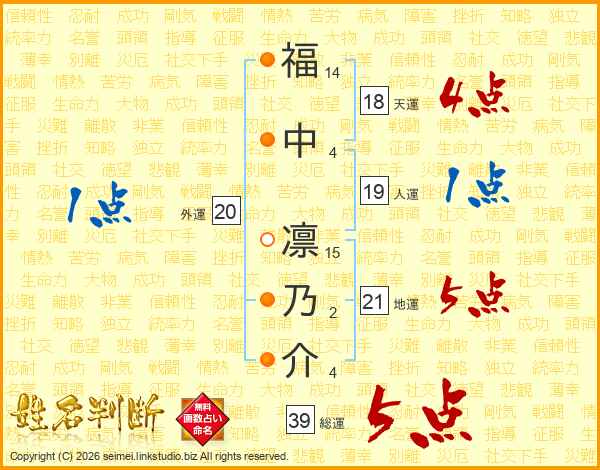 福(14画)中(4画) 凛(15画)乃(2画)介(4画)
