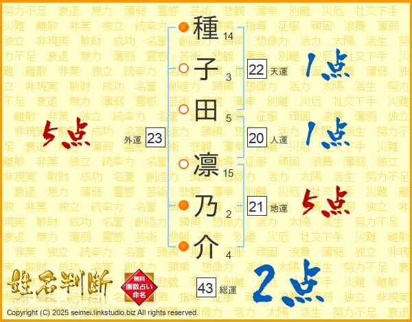 種(14画)子(3画)田(5画) 凛(15画)乃(2画)介(4画)